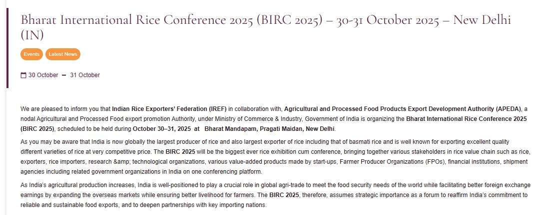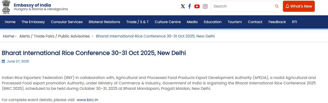 The Embassy of India in Hungary, Bosnia and Herzegovina stated on its official website: ”Indian Rice Exporters’ Federation (IREF) in collaboration with, Agricultural and Processed Food Products Export Development Authority (APEDA), a nodal Agricultural and Processed Food export promotion Authority, under Ministry of Commerce & Industry, Government of India is organizing the Bharat International Rice Conference 2025 (BIRC 2025), scheduled to be held during October 30–31, 2025 at Bharat Mandapam, Pragati Maidan, New Delhi” and further promoted Participation from rice-related stakeholders in Hungary, Bosnia and Herzegovina.