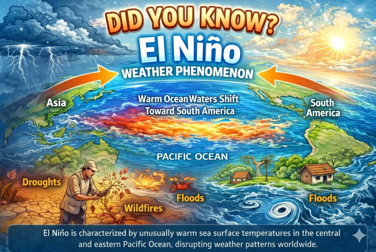 El Niño is a natural climate phenomenon that occurs when surface waters in the central and eastern Pacific Ocean become unusually warm. This warming changes global weather patterns, often leading to droughts in some regions and heavy rainfall in others.
