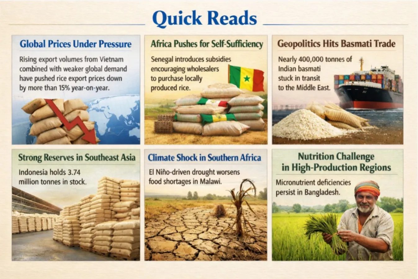 In Bangladesh, despite impressive growth in rice production, concerns remain about nutrition and food quality. Bangladesh became world’s third-largest rice producer, with production rising from 10.9 million metric tons in 1971 to 42 million metric tons in 2022. However, heavy reliance on rice in daily diets has contributed to widespread micronutrient deficiencies. Health data shows that 28% of children under five are stunted, 37% of women of reproductive age are anaemic, and about 13% of the population is undernourished. Researchers suggest that farmers’ preference for high-yielding rice varietieshas contributed to this issue, as nutritional traits and climate resilience are often overlooked when selecting crops.Overall, these developments highlight the complex changes taking place in the global rice sector, where production trends, trade policies, climate impacts, and geopolitical tensions continue to influence supply, prices, and food security across different regions.