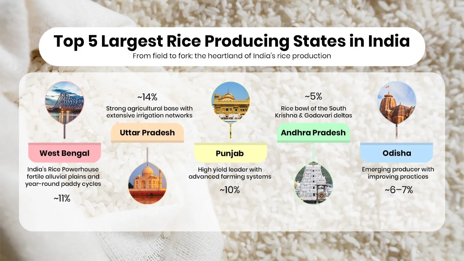 Together, these states account for a significant share of rice production in India, supporting domestic supply and export potential.